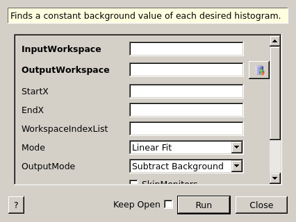 | SkipMonitors | Input | boolean | False | By default, the algorithm calculates and removes background from monitors in the same way as from normal detectors If this property is set to true, background is not calculated/removed from monitors. |