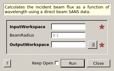 Input must be a workspace in units of Wavelength, corresponding to an empty beam measurement. It needs to have the same number of bins for all the spectra, but it does not have to have exact same wavelength axes. The algorithm will take the global minimum and the global maximum of the wavelengths in the input workspace, and make equidistant bins such that it has the same number of bins as the input. The input has to be already normalised in the same fashion, as the sample workspaces that are going to be normalised with the flux calculated with this algorithm. For example, if the input is normalised by time, the flux will mean number of neutrons per second.