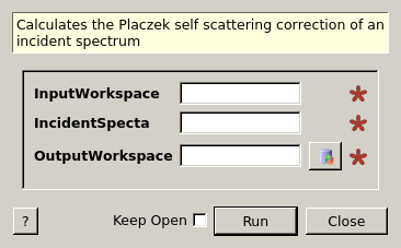 | OutputWorkspace | Output | MatrixWorkspace | Mandatory | Workspace with the Self scattering correction |