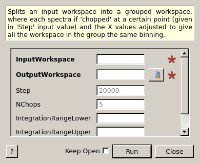 Splits an input workspace into a grouped workspace, where each spectra if ‘chopped’ at a certain point (given in ‘Step’ input value) and the X values adjusted to give all the workspace in the group the same binning.