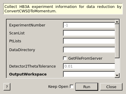 This algorithm is to create input workspaces to ConvertCWSDExpToMomentum for HB3A (four-circle single crystal diffractometer in HFIR).
