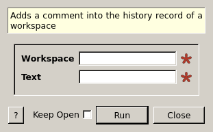 This simple algorithm just adds a comment record to the history of a workspace and is a simple way of annotating your workflow.