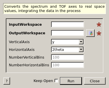This converts the workspace into a 2D view of real space detector positions based on the detector positions. This is intended for rapid visualization and has been optimized for speed for use in Live data streams. If the data provided has data binned in Time of flight or any other unit this will be integrated into a single value per detector, before converting to the selected detector and rebinning to the new grid. The output grid is based in the maximum and minimum values of the detectors for axes selected, and the number of bins selected. The rebinning is simply based on centre point rebinning, and as such can be prone to moire based artefacts, however it is fast.