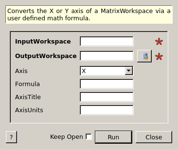 This algorithm allows users to adjust the axes of a workspace by a user defined math formula. It will adjust the data values (other than in one case the X values) of a workspace, although it will reverse the spectra if needed to keep the X values increasing across the workspace. This only works for MatrixWorkspaces, so will not work on Multi Dimensional Workspaces or Table Workspaces. If you specify one of the known Units then that will be the resulting unit, otherwise like the ConvertSpectrumAxis v2 algorithm the result of this algorithm will have custom units defined for the axis you have altered, and as such may not work in all other algorithms.