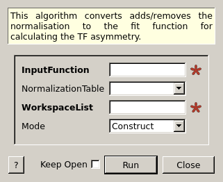 | Mode | Input | string | Construct | Mode to run in. Construct will convert theinput function into one suitable for calculating the TF Asymmetry. Extract will find the original user function from a function that is suitable for TF Asymmetry calculations. Allowed values: [‘Extract’, ‘Construct’] |