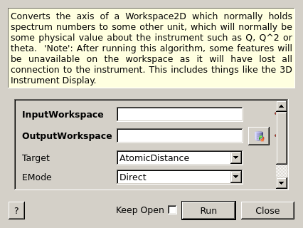 | Target | Input | string | Mandatory | The unit to which the spectrum axis should be converted. This can be either “theta” (for <math>theta</math> degrees), or any of the IDs known to the [[Unit Factory]]. Allowed values: [‘AtomicDistance’, ‘Degrees’, ‘DeltaE’, ‘DeltaE_inFrequency’, ‘DeltaE_inWavenumber’, ‘dSpacing’, ‘dSpacingPerpendicular’, ‘Empty’, ‘Energy’, ‘Energy_inWavenumber’, ‘Label’, ‘Momentum’, ‘MomentumTransfer’, ‘QSquared’, ‘SpinEchoLength’, ‘SpinEchoTime’, ‘Temperature’, ‘Time’, ‘TOF’, ‘Wavelength’, ‘theta’, ‘signed_theta’] |