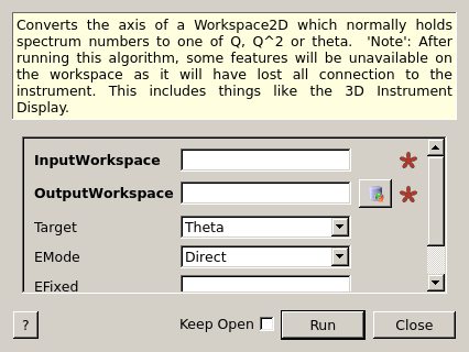| Target | Input | string | Mandatory | The unit to which spectrum axis is converted to - “theta” (for the angle in degrees), Q or Q^2, where elastic Q is evaluated at EFixed. Note that ‘theta’ and ‘signed_theta’ are there for compatibility purposes; they are the same as ‘Theta’ and ‘SignedTheta’ respectively. Allowed values: [‘Theta’, ‘SignedTheta’, ‘ElasticQ’, ‘ElasticQSquared’, ‘theta’, ‘signed_theta’, ‘ElasticDSpacing’] |