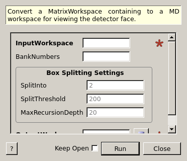 | OutputWorkspace | Output | MDEventWorkspace | Mandatory | Name of the output MDEventWorkspace. |
