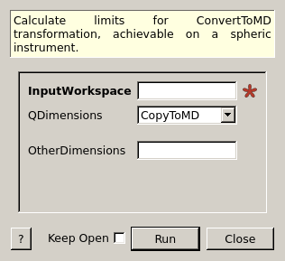 | QDimensions | InOut | string | CopyToMD | String, describing MD-analysis modes, this algorithm can process. There are 3 modes currently available and described in details on*MD Transformation factory* page. The modes names are CopyToMD, |Q| and Q3D. Allowed values: [‘CopyToMD’, ‘Q3D’, ‘|Q|’] |