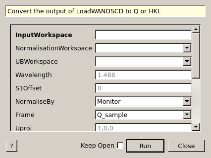 | Frame | Input | string | Q_sample | Selects Q-dimensions of the output workspace. Allowed values: [‘Q_sample’, ‘HKL’] |