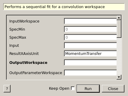 Performs a sequential fit involving a convolution with a defined resolution. This algorithm is a special-case of QENSFitSequential, which calculates the elastic incoherent scattering factor when a delta function is provided in the fitting model.
