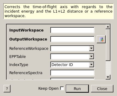 Corrects the time-of-flight axis with regards to the incident energy and the L1+L2 distance or a reference workspace.