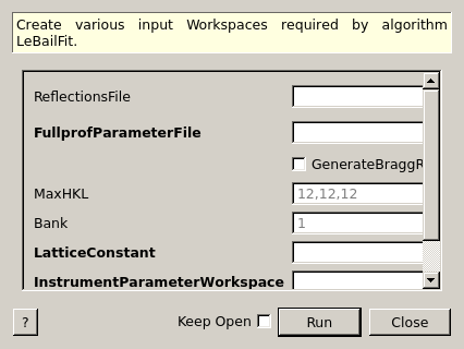 | GenerateBraggReflections | Input | boolean | False | Generate Bragg reflections other than reading a Fullprof .irf file. |