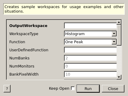 | Function | Input | string | One Peak | Preset options of the data to fill the workspace with. Allowed values: [‘Exp Decay’, ‘Flat background’, ‘Multiple Peaks’, ‘One Peak’, ‘Powder Diffraction’, ‘Quasielastic’, ‘Quasielastic Tunnelling’, ‘User Defined’] |