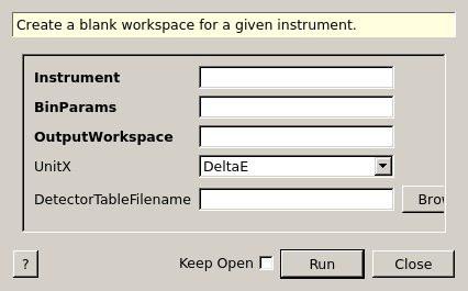 Creates a blank workspace for a given instrument with the option of pulling in detector tables from a RAW/NeXus data file. The histogram sizes are given by binning parameters, see Rebin v1, rather than explicit data arrays. There is also an option to set the X axis unit.