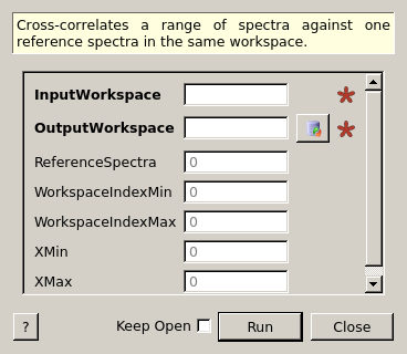 | WorkspaceIndexMin | Input | number | 0 | The workspace index of the first member of the range of spectra to cross-correlate against. |