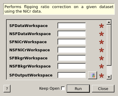| NSFNiCrWorkspace | Input | MatrixWorkspace | Mandatory | A workspace with non spin-flip NiCr data. |