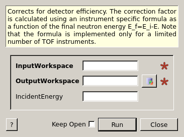 | InputWorkspace | Input | MatrixWorkspace | Mandatory | The workspace to correct for detector efficiency |