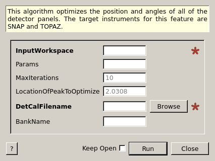 | InputWorkspace | Input | EventWorkspace | Mandatory | The workspace containing the geometry to be calibrated. |