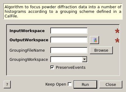 | OutputWorkspace | Output | MatrixWorkspace | Mandatory | The result of diffraction focussing of InputWorkspace |