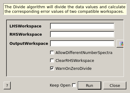 | RHSWorkspace | Input | MatrixWorkspace | Mandatory | The name of the input workspace on the right hand side of the operation |