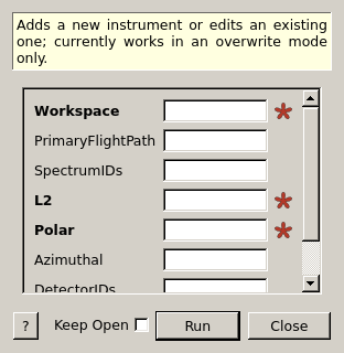 #. Add an Instrument to a Workspace without any real instrument associated with, or #. Replace a Workspace’s Instrument with a new Instrument, or #. Edit all detectors’ parameters of the instrument associated with a Workspace (partial instrument editing is not supported).