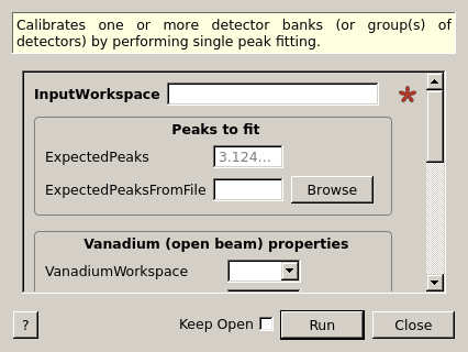 | InputWorkspace | Input | MatrixWorkspace | Mandatory | Workspace with the calibration run to use. |
