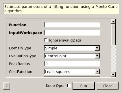 | OutputWorkspace | Output | TableWorkspace | Optional: A table workspace with parameter sets producing the smallest values of cost function. (Monte Carlo only) | |