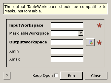 | MaskTableWorkspace | Input | TableWorkspace | A mask table workspace containing 3 columns: XMin, XMax and DetectorIDsList. | |