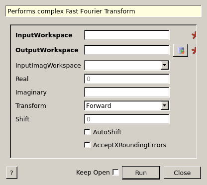 | InputImagWorkspace | Input | MatrixWorkspace | The name of the input workspace for the imaginary part. Leave blank if same as InputWorkspace | |
