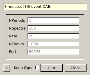 Simulates ISIS event DAE. It runs continuously until canceled and listens to port 10000 for connection. When connected starts sending event packets.