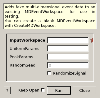 Adds fake multi-dimensional event data to an existing MDEventWorkspace, for use in testing. You can create a blank MDEventWorkspace with CreateMDWorkspace.