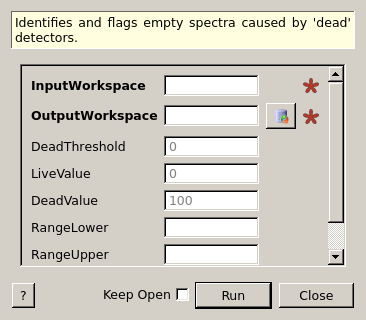 | OutputWorkspace | Output | MatrixWorkspace | Mandatory | Each histogram from the input workspace maps to a histogram in this workspace with one value that indicates if there was a dead detector |
