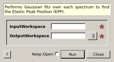 This utility algorithm attempts to search for the elastic peak position (EPP) in each spectrum of the given workspace. The algorithm estimates the starting parameters and performs Gaussian fit using the Fit v1 algorithm.