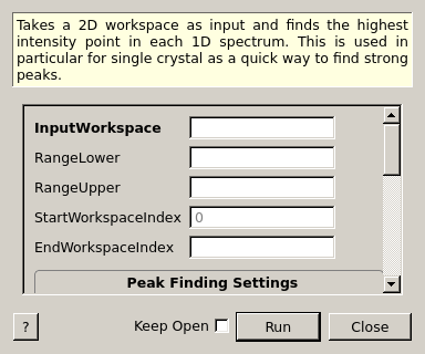 Takes a 2D workspace as input and finds the highest intensity point in each 1D spectrum. This is used in particular for single crystal as a quick way to find strong peaks.