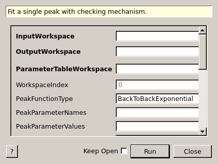 | InputWorkspace | Input | MatrixWorkspace | Mandatory | Name of the input workspace for peak fitting. |