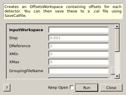 | GroupingFileName | Input | string | Optional: The name of the output CalFile to save the generated OffsetsWorkspace. Allowed extensions: [‘.cal’] | |
