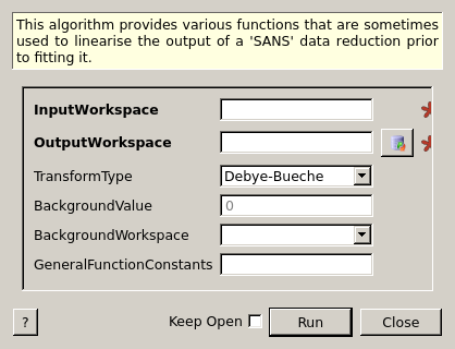 This algorithm is intended to take the output of a SANS reduction and apply a transformation to the data in an attempt to linearise the curve. Optionally, a background can be subtracted from the input data prior to transformation. This can be either a constant value, another workspace or both. Note that this expects a single spectrum input; if the input workspace contains multiple spectra, only the first will be transformed and appear in the output workspace.