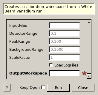 | OutputWorkspace | Output | Workspace | Mandatory | Output workspace for calibration data. |