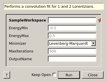 | Minimizer | Input | string | Levenberg-Marquardt | Type of minimizer. Allowed values: [‘Levenberg-Marquardt’, ‘FABADA’] |
