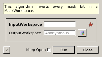 | InputWorkspace | Input | MaskWorkspace | Mandatory | MaskWorkspace to be inverted. |