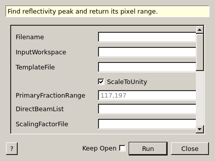 | FindPeaks | Input | boolean | False | Find reflectivity peaks instead of using the template values |