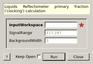 Used in the Liquids Reflectometer reduction at the SNS, this algorithm computes the primary fraction (aka ‘clocking correction’) for the given data. The primary fraction is the fraction of the counts within a specified range that should contain the reflected beam to the total number of counts on the detector.