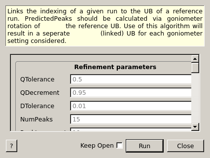 Links the indexing of a given run to the UB of a reference run. PredictedPeaks should be calculated via goniometer rotation of the reference UB. Use of this algorithm will result in a seperate (linked) UB for each goniometer setting considered.