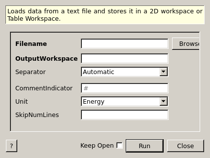 The LoadAscii2 algorithm reads in spectra data from a text file and stores it in a Workspace2D as data points, or a Table Workspace if it is table data. The data in the file must be organized in columns separated by commas, tabs, spaces, colons or semicolons. Only one separator type can be used throughout the file; use the “Separator” property to tell the algorithm which to use. The algorithm SaveAscii2 is normally able to produce such a file.