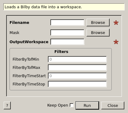 | FilterByTofMax | Input | number | Optional | Optional: To exclude events that do not fall within a range of times-of-flight. This is the maximum accepted value in microseconds. Keep blank to load all events. |