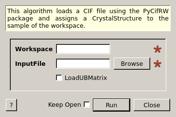 This algorithm loads a CIF file using the PyCifRW package and assigns a CrystalStructure to the sample of the workspace.