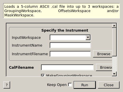| CalFilename | Input | string | Mandatory | Path to the old-style .cal grouping/calibration file (multi-column ASCII). You must also specify the instrument. Allowed extensions: [‘.cal’] |