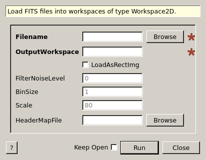 Load FITS files, which typically contain images, into a WorkspaceGroup. FITS stands for Flexible Image Transport System, see http://en.wikipedia.org/wiki/FITS. A new workspace (of type Workspace2D) is created for every FITS file loaded with this algorithm, and these workspaces are added into a WorkspaceGroup. The group workspace is named as indicated in the OutputWorkspace input property. The workspaces included in the group are named with the same name and an appendix _1, _2, etc., incremented sequentially as new files are loaded with the same OutputWorkspace property.