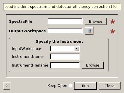 | SpectraFile | Input | string | Mandatory | Incident spectrum and detector efficiency correction file. Allowed extensions: [‘.dat’] |